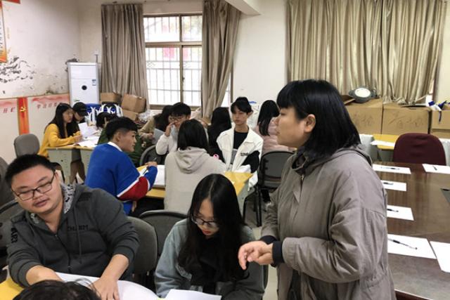 培训前二十分钟,进行暖场活动。当同学们按签到表的分组情况就坐后,培训员引导各小组选组长、起组名并介绍各自小组。培训员幽默的讲话风格缓解了同学们的紧张和拘谨。接着,培训员分发学习材料,开始学习无领导小组的理论知识,大家很快进入状态,纷纷以小组为单位展开学习、讨论,并将学到的要点记录在纸上。十分钟后,每组派一个代表向大家展示小组讨论成果。在其他小组代表发言时,剩余成员耐心倾听,思考与他人观点的不同之处,总结相同之处,互相学习,共同成长。接着,进入模拟无领导小组面试阶段。首先,每组推荐两名同学参加面试,其余同学观摩。参与面试的同学有两分钟的阅读材料和准备时间,小组成员每人一分钟轮流发表自己的观点并阐述原因,同学们通过生活中的实际案例,各抒已见,不断碰撞出思想的火花。接着,小组讨论十五分钟,并派出代表进行总结。提问环节,经过小组交流,每个小组做一分钟的点评,并提出一个问题,由曹雯老师进行最后点评。活动最后,同学们主动分享今天的所学所感,使大家的收获和体验更加深刻。