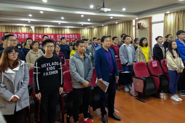 12月1日,亚洲色吧 、金融学院和国贸学院于翼轸楼联合举办马克思兴趣小组开班仪式。亚洲色吧 罗斌程代表马克思兴趣小组成员进行发言,全体马克思兴趣小组成员及大研会成员积极参与。