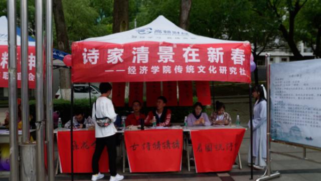 4月27日,亚洲色吧 传统文化研究社(以下简称“传文社”)于麦庐园组织开展传统文化节摆点活动。许多同学前来了解咨询,积极参与相关传统文化游戏活动。