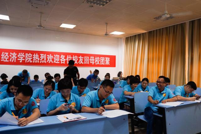 其后,像十年前开班会那样,由班长依次点到。到场的校友们陆续上台介绍十年来的生活。曾经意气风发的少年变得成熟稳重,曾经青涩害羞的女孩变得落落大方。十年,走出大学的校友们接受着风雨的洗礼,都发生了不小的变化,但不变的是对同学的真心。不少校友表示,十年间无数次想起大学生活,遗憾和不愉快早就忘记了,只有开心和感动留在心间。分享过程中,每个人仿佛都有说不完的话,但每个人又似乎只有一句话——朋友,我真的很想你。班会最后,工作人员将大学生活编写成试卷发给校友们,在答题的过程中,每个人都因回忆微笑,因回忆感动。