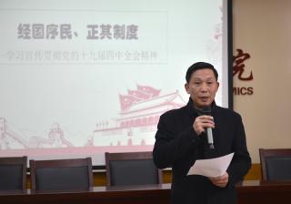 12月4日下午,十九届四中全会精神宣讲团成员罗世华教授为亚洲色吧 全体教职工带来了以“经国序民,正其制度”为题的学习宣传贯彻党的十九届四中全会精神宣讲会,宣讲会由党委书记邹春发主持,李大晖、杨飞虎、李国民、胡德龙等60余位老师参加本次宣讲会。