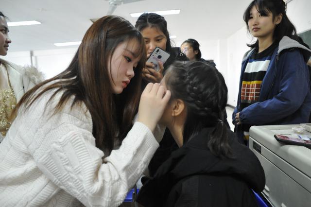 当天,参演同学身着单薄的演出服,在休息室内一遍遍练习;工作人员为准备同学们的妆发和各类用品忙前忙后,一点一滴都展现出经院学子的奉献精神和同学之间的互助情谊。陪伴同学们训练近两个月的马星宇老师也加入到备战中来,认真反复地检查表演队形,确认每个声部的音准状态。