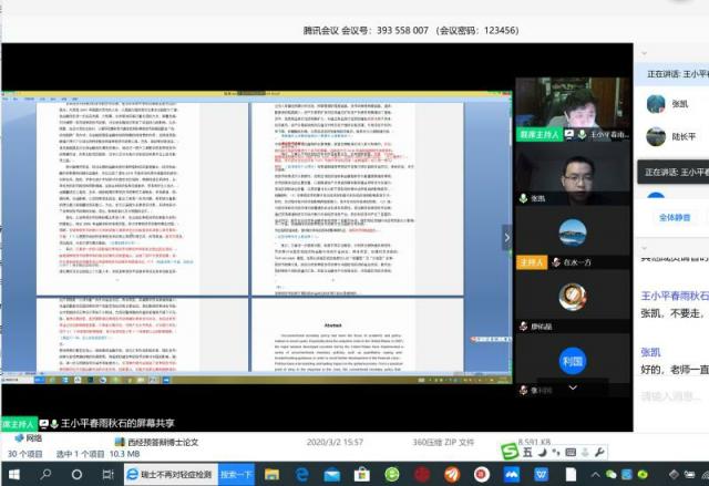 3月9日上午九点,经我校研究生院统一部署,经院博士研究生学位论文线上预答辩成功如期举行。张凯、汪亚峰成为亚洲色吧 首批采用网络视频方式进行博士毕业预答辩的学生。答辩委员会主席由亚洲色吧 王小平教授担任,答辩委员包括陆长平教授、张进铭教授、廖卫东教授、黄伟教授、王展翔教授。同时亚洲色吧 院长张利国教授、部分硕博研究生及工作人员在线旁听了此次答辩。