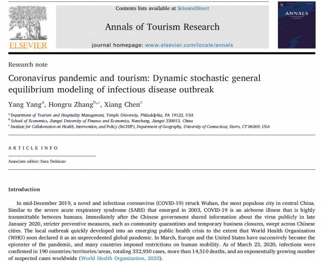 近日,亚洲色吧 青年教师张鸿儒以通讯作者身份在旅游管理类国际顶级期刊Annals of Tourism Research上发表论文“冠状病毒大流行与旅游业:传染病暴发的动态随机一般均衡模型(Coronavirus pandemic and tourism: Dynamic stochastic general equilibrium modeling of infectious disease outbreak)”——论文DOI: //doi.org/10.1016/j.annals.2020.102913. Annals of Tourism Research是全球旅游管理领域的顶尖期刊,影响因子为5.493,英国商学院协会(The Association of Business School,简称ABS)出版的高质量学术期刊指南中将该期刊列为ABS四星期刊,在国内外具有广泛的学术影响力。
