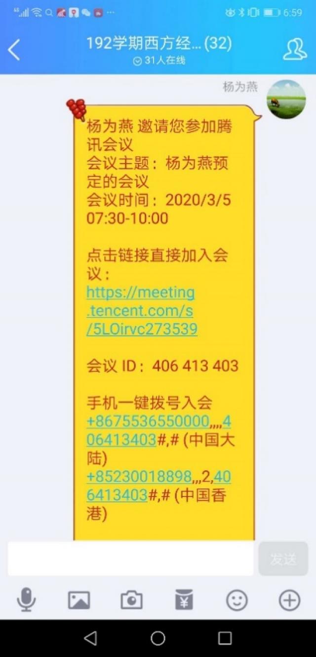 2.开课前在 QQ 群里发布预订的腾讯会议的加入方式, 提醒学生准时到课。