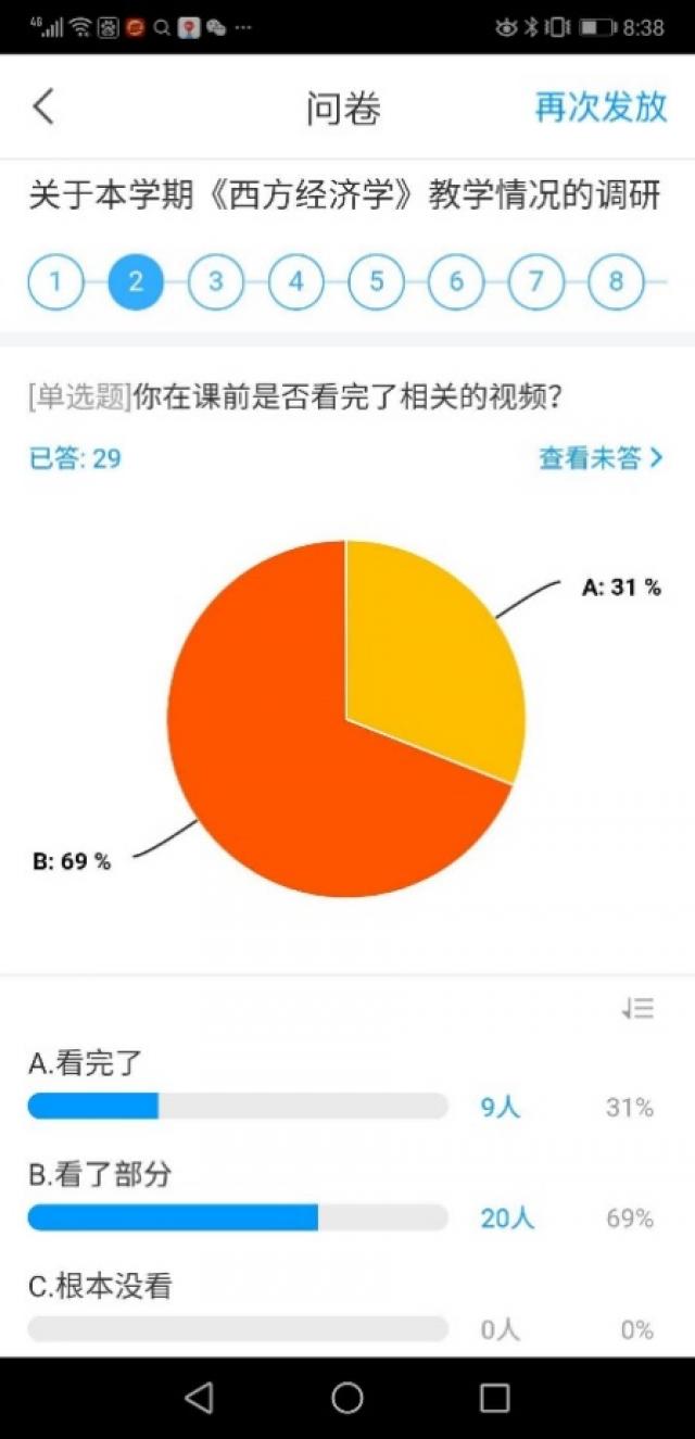本学期《西方经济学》采用SPOC教学模式,是一种融合了实体课堂与在线教育的混合教学模式,它既融合了MOOC的优点,又弥补了传统课堂教学的不足。可以使教师和学生在一个“开放、共享、交互、协作”的空间,通过翻转课堂教学模式,全面增强课堂的互动性,充分体现“以学生为中心”“以产出为导向”的先进教育理念。