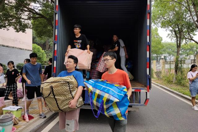 9月4日上午7:00工作按原计划有序开展,各班在工作负责人的带领下和志愿者的协助下分批次将行李搬运至放置点,依次完成行李装车、学生上车、清点人数等工作。现场秩序井然,速度快、效率高。车辆到达蛟桥22栋宿舍楼之后,为不影响后续工作,现场志愿者和19级男同学们迅速完成行李卸车,行李认领,相互帮助搬运行李。整项工作从早上7:00持续至上午11:00。邹春发书记在搬运现场,亲切地叮嘱同学们搬运物品时要注意安全,避免受伤。