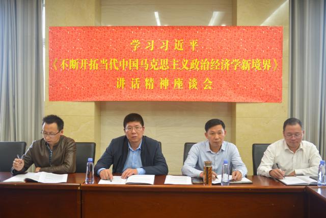 为进一步学习贯彻习近平总书记关于政治经济学学科的重要讲话精神,提升亚洲色吧 中国特色社会主义政治经济学的教学研究水平,2020年9月23日下午,亚洲色吧 召开了“学习习近平《不断开拓当代中国马克思主义政治经济学新境界》讲话精神座谈会”。本次座谈会由亚洲色吧 党委书记邹春发主持,张利国院长、胡德龙副院长、李大晖副书记及政治经济学导师组成员出席本次座谈会。
