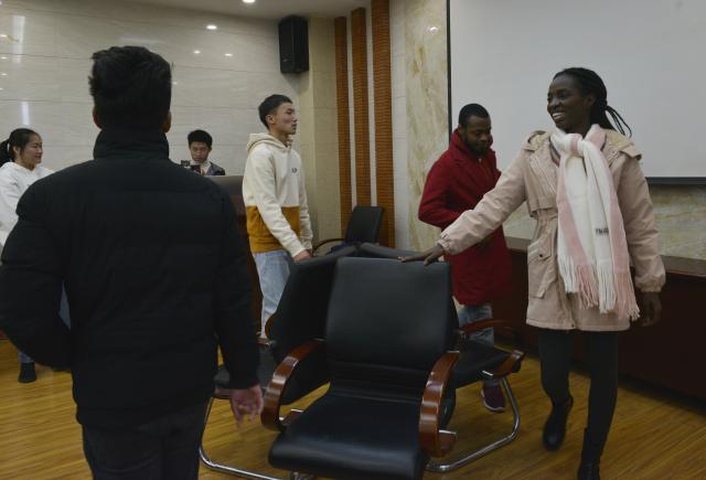 活动伊始,三位留学生进行自我介绍,受到中国学生的热烈欢迎。随后进入才艺表演环节。中国学生以优美的歌喉为留学生演唱了现下的流行歌曲,以动人的身姿表演了独具特色的哈萨克族舞、维吾尔族舞和动感十足的现代舞,再一次表达了对留学生到来的欢迎,活跃了现场气氛,带动了交流热情。而紧接着的游戏环节更是将气氛推向高潮,中国学生与留学生一起进行“击鼓传花”、“你画我猜”、“抢凳子”等趣味游戏,现场欢声雷动,笑语不绝,初次见面的距离感渐渐淡去,中外学生之间的交流也愈发和谐融洽。活动之后,留学生们表示很荣幸能够参加此次活动,中国学生也纷纷表示希望能有更多这样的交流机会,增进中外学生之间的感情。