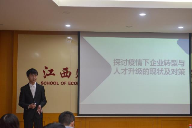 活动开始,主持人介绍了本次比赛的评委与参赛流程。本次比赛由团队介绍视频、论文成果展示与现场答辩三部分组成。介绍环节,参赛团队以PPT的形式进行论文成果展现,所讨论的话题均为当下的热点问题,像远程办公、直播带货、共享经济、疫情背景下的餐饮行业、科技+旅游等等。同学们侧重于数据收集与分析来展示自己的论题,对研究成果进行深入浅出的分析与展示。答辩环节,评委们通过对参赛团队提交的论文进行分析,针对性地提出相关问题。提问内容侧重于参赛团队对热点问题的调查方式、了解与看法。参赛者们则结合自己的调查研究与所学知识,从容不迫地回答评委提出的问题。此环节不仅仅是简单的学术问答,更多的是参赛者与评委老师之间的交流学习,共同探讨有关的现实性问题。同时,评委老师们也向部分参赛者提出针对性研究建议与研究方向。活动最后,主持人介绍了获奖情况。
