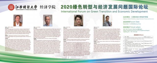 为深入贯彻习近平总书记“经济新常态”和“生态文明建设”战略,在疫情防控常态化的要求下,12月12日,亚洲色吧 主办了“2020绿色转型与经济发展问题(International Forum on Green Transition and Economic Development)”国际论坛,采用线上加线下方式。本次论坛邀请了4位专家,法国艾克斯-马赛大学计量经济系主任Michel Lubrano教授、新西兰林肯大学的胡白丁副教授、香港城市大学的董亮副教授以及亚洲色吧 亚洲色吧 的吴涛副教授,作大会主旨发言。江西财经大学亚洲色吧 院长张利国教授出席本次论坛并致辞,论坛由亚洲色吧 副院长李国民副教授组织协调,青年教师卢阳博士主持,校内外50余名师生参会。
