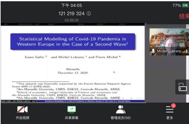 论坛第二环节,由四位专家分别做主旨报告。Michel Lubrano教授带来题为“预测西欧covid-19疫情的关键时刻:第二波疫情的流行病学与现象学模型(Predicting key moments of covid-19 pandemia in Western Europe: epidemiological versus phenomenological models in the case of a second wave)”的主旨报告。他结合10个西欧各国的疫情数据,将流行病学模型引入经济分析,运用SIR模型来预测疫情的未来发展,最后预测出各国疫情的发展趋势和对经济发展的影响。