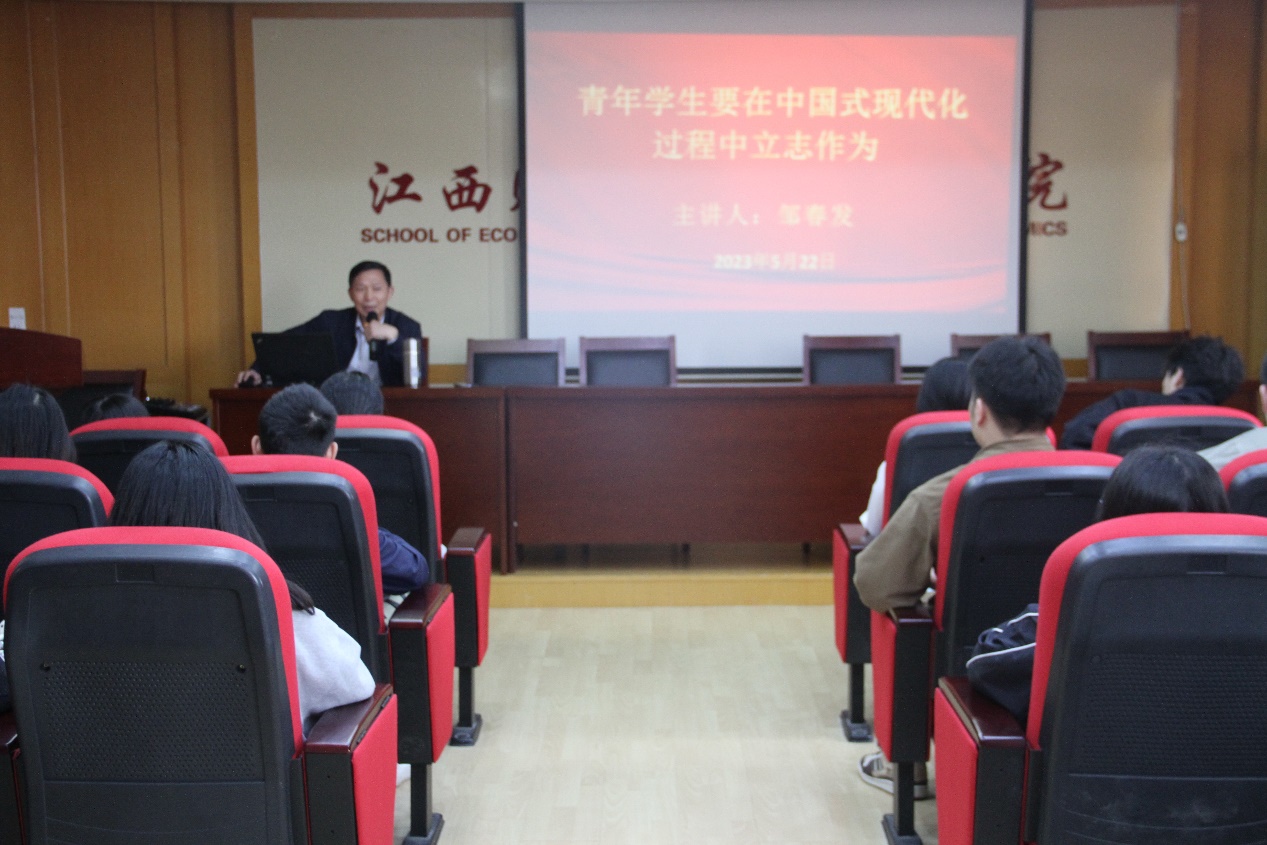 习近平总书记在党的二十大报告中指出,“从现在起,中国共产党的中心任务就是团结全国各族人民全面建成社会主义现代化强国、实现第二个百年奋斗目标,以中国式现代化全面推进中华民族伟大复兴”。对于广大青年学生要在中国式现代化过程中立志作为,邹春发书记提出了四点希望,一是要用科学的理论装头脑,深入学习习近平新时代中国特色社会主义思想,用科学的理论指导中华民族伟大复兴;二是要树立为民族复兴而奋斗的志向目标,把自己的志向融入到民族复兴和中国式现代化的战略目标和安排中去;三是要练就过硬能力和扎实本领,只有拥有过硬能力和扎实本领才能更好地服务现代化;四是要培养勇毅前行的品格,在困难和挫折面前要不屈不挠,要有战胜困难的勇气和信心。