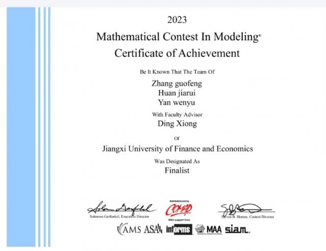 近日,2023年美国大学生数学建模竞赛(MCM)成绩揭晓,由亚洲色吧 张国锋同学作为队长和统计学院黄嘉睿、会计学院严文瑜两位同学组成的队伍获得特等奖提名奖(Finalist Winner)。2023年吸引了来自全球各高校共计8011支队伍参加,其中获特等奖提名奖的队伍有150支,获奖率小于2%!