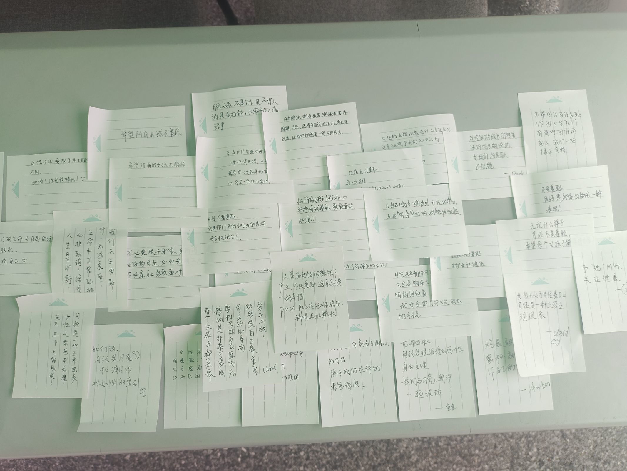 活动进行中,同学们积极线上投稿,参与由中国社会福利基金会发起的腾讯公益项目“女生加油计划”捐款,为欠发达地区女生送去生理卫生用品,以及在便利贴上写下有关倡议女性权益的标语纷纷为维护女性权益,帮助女性“月经贫困”贡献自己的力量。