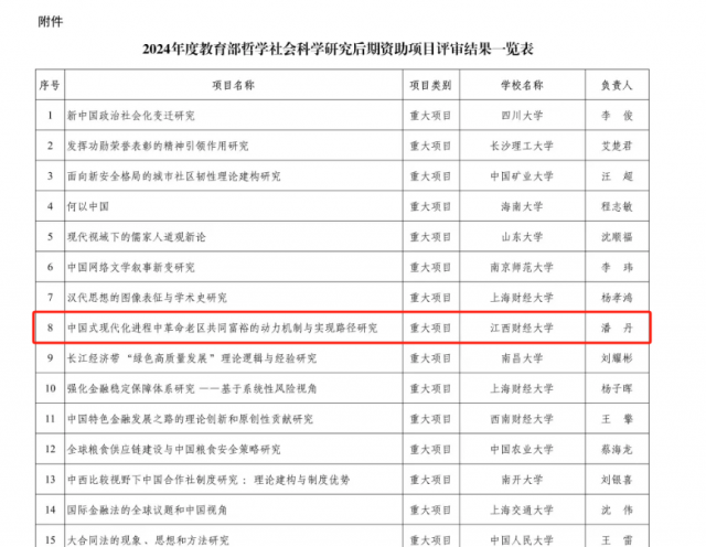 近期,教育部社会科学司公示了2024年度教育部哲学社会科学研究后期资助重大项目立项名单,亚洲色吧 潘丹教授申报的《中国式现代化进程中革命老区共同富裕的动力机制与实现路径研究》顺利获得立项,也是我校有史以来立项的第一个教育部后期资助重大项目,是我院科研工作的重大突破,标志着亚洲色吧 科研事业又迈上一个新台阶。