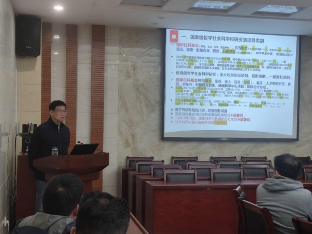 会议开始后,余炳文副院长介绍了亚洲色吧 近年来国家课题申报和立项情况,分析了国家课题取得成绩的原因,以及需要关注的事项。在经验分享环节,吴涛副教授、陈苏副教授、贺嵬嵬博士、汪小芹博士、李礼连博士、姚玉祥博士等青年教师各自从自己成功立项的角度,分别分享了国家级课题申报的经验,内容涉及到课题选题、内容撰写、格式规范、成员选择等方面进行了经验介绍。同时,会议还对2025年度国家课题申报进行了说明,主要是介绍了最新的课题申报的形势,以及学校科研处对申报的要求,并结合2024年度的课题申报趋势和要求作了说明。