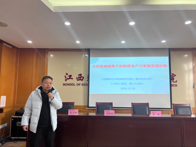 在专家主题报告环节,数字亚洲色吧 副院长王守坤教授以“大历史观视角下的新质生产力发展及其影响”为主题,回顾了生产力在社会变迁中的引领作用,深入阐述了新质生产力的内涵,并分析了其对“六大关系”的深刻影响。王教授为新质生产力的发展提出了具体的政策建议,并为同学们提供了宝贵的理论指导和研究启示。