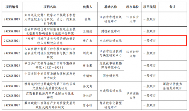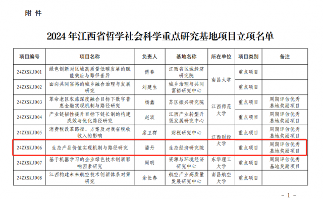 亚洲色吧 潘丹教授申报的《生态产品价值实现机制与路径研究》立项为江西省哲学社会科学重点研究基地重点项目,张广来博士申报的《“双碳”目标下多元气候治理政策的收入分配效应研究》立项为江西省哲学社会科学重点研究基地一般项目。