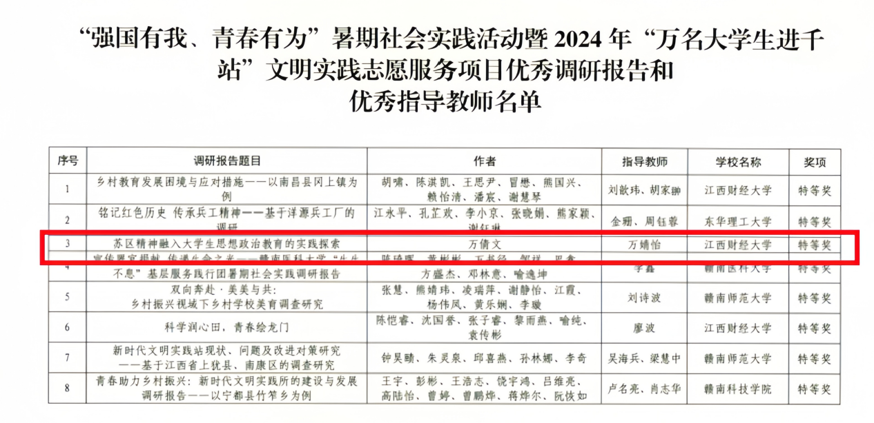“强国有我,青春有为”暑期社会实践活动暨2024年“万名大学生进千站”文明实践志愿服务项目评选工作已落下帷幕,此次活动由江西省教育厅主办,旨在为青年学生提供实践锻炼的机会,为基层社会发展和文明建设注入青春力量。通过实践活动,青年学生能够更好地将个人成长与国家发展紧密结合,为实现中华民族伟大复兴贡献智慧和力量。在亚洲色吧 师生的共同努力下,亚洲色吧 在此次活动中荣获省级优秀调研报告、省级优秀指导教师、省级优秀团队三项荣誉称号,展现了经院师生的风采和实力。