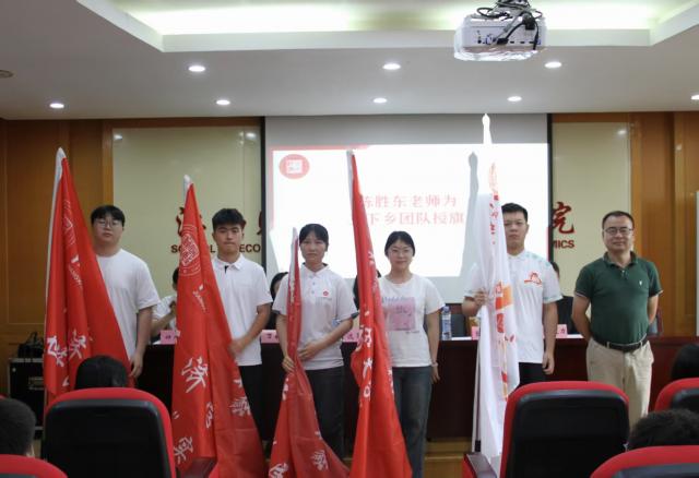 陈胜东为社会实践团代表授旗,旗帜引领方向,接过旗帜就肩负起了学院的期望,希望各团队能扛起责任,在实践中贡献青春力量。