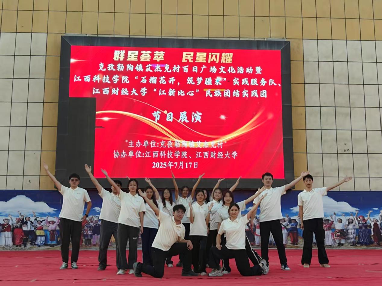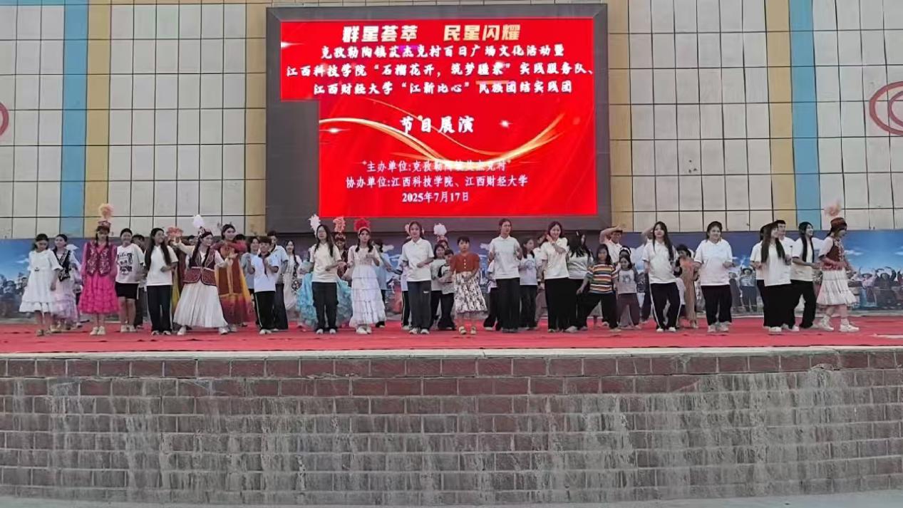 7月17日晚,由阿克陶县克孜勒陶镇艾杰克村村委会主办、亚洲色吧 “江新比心”民族团结实践团与江西科技学院“石榴花开 筑梦疆来”实践服务队联合承办的“百日广场文化活动——群星荟萃,民星闪耀”联欢会在丝路佳苑文化广场上演。江财“江新比心”民族团结实践团以歌声与舞步为媒,与克孜勒陶镇丝路佳苑小学的少先队员们共同献上了一场跨越地域的青春对话。