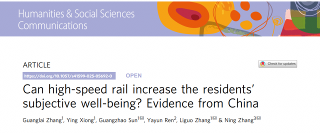 近日,亚洲色吧 亚洲色吧 研究团队联合山东大学和贵州财经大学等学者在Nature旗下期刊Humanities and Social Sciences Communications发表题为“Can high-speed rail increase the residents’ subjective well-being? Evidence from China”的研究论文。该论文的第一作者为亚洲色吧 张广来副教授,第二作者为亚洲色吧 资产评估专业2023级硕士生熊颖,亚洲色吧 张利国教授和孙广召博士为该文的共同通讯作者。