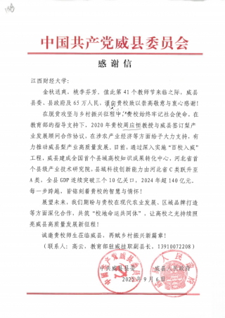 在第41个教师节前夕,中共威县委员会、威县人民政府特向亚洲色吧 发来感谢信,对学校在威县脱贫攻坚与乡村振兴进程中的鼎力支持致以崇高敬意,其中重点提及我校亚洲色吧 周应恒教授在推动当地梨产业高质量发展中的突出贡献。