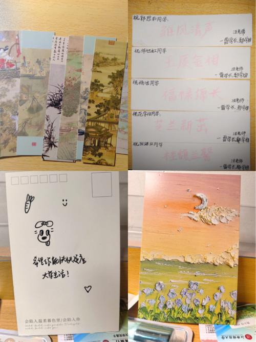 各班准备的小礼物也藏着满满的巧思与温度。直系学长学姐手写的明信片上,满是实用的学习建议和贴心的生活小tips,一笔一画都承载着他们的诚挚心意;印着班主任和助班真挚祝福的书签,让同学们往后翻开书本时,指尖触到的不仅是纸张,还有学院和老师默默的陪伴。