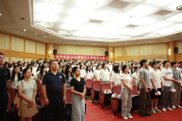 25级资产评估班陈新斌、数字经济252班宋子鑫作为新生代表发言,表达了对大学生活的期待与奋进决心,展现出经院新生的青春朝气。