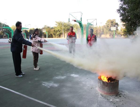 篮球场的实操教学环节,保卫科工作人员通过结合具体案例,深入浅出地教学灭火器、高压水枪的使用方法和注意事项,将“提、拔、握、压”的灭火器使用口诀与高压水枪的操控技巧讲解的深入人心。同学们踊跃参与实操,在工作人员的耐心指导下,亲手完成灭火演练,真切感受火焰扑灭的瞬间,将理论知识转化为实战能力。