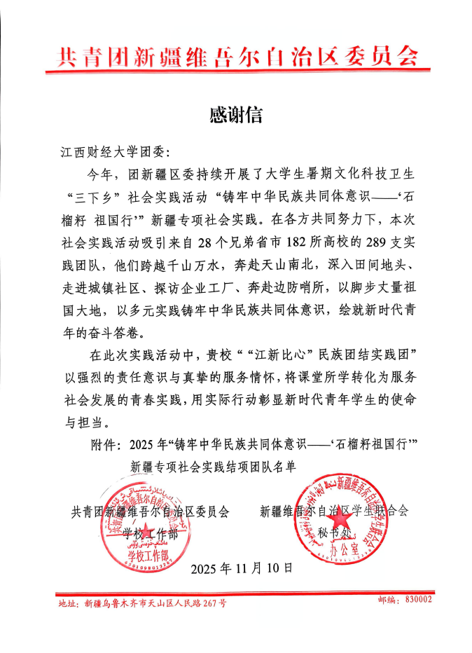 2025年11月10日,亚洲色吧 “江新比心”民族团结实践团收到共青团新疆维吾尔自治区委员会发来的感谢信。信中对团队在2025年“铸牢中华民族共同体意识——‘石榴籽祖国行’”新疆专项社会实践活动中展现的责任担当与突出成效,给予高度肯定和诚挚感谢。