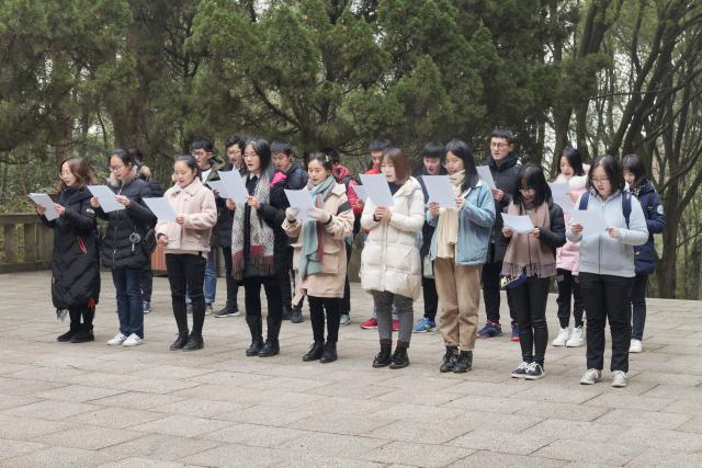 当天上午八点半,同学们准时从蛟桥园乘车前往方志敏爱国事迹陈列馆进行参观及扫墓活动。踏入陈列馆大门,映入眼帘的是一尊方志敏烈士的雕塑。同学们纷纷停下脚步,怀着崇高的敬意瞻仰革命先烈风姿。随后,同学们前往方志敏烈士墓进行扫墓。墓道由十一层共一百五十七级台阶构成,寓意着方志敏同志自入党至牺牲,为共产主义事业奋斗的十一个春秋,从任赣东北特区苏维埃主席至牺牲时的一千五百七十个日夜。扫墓正式开始,同学们齐声朗诵方志敏同志《可爱的中国》的节选片段,激昂的文字,洪亮的声音,将一位革命家奋进不屈的热血、深入灵魂的爱国情怀、渴望祖国强大的迫切愿望展现的淋漓尽致。伴随着悠悠的诗歌朗诵——《致方志敏》,仿佛看到英雄重燃热血,吹响战歌。同学们用真挚的声音向方志敏烈士诉说了今日中国飞速发展、傲然屹立于世界东方的风姿,表达了当今青年保家卫国的强大决心。同学们纷纷在方志敏雕像前献上花圈并默哀。默哀毕,在工作人员的带领下,小组成员进入方志敏烈士事迹陈列室参观,了解方志敏烈士的生平。随着工作人员的讲解,“爱国、创造、清贫、奉献”的方志敏精神深深扎根于同学们的心中。