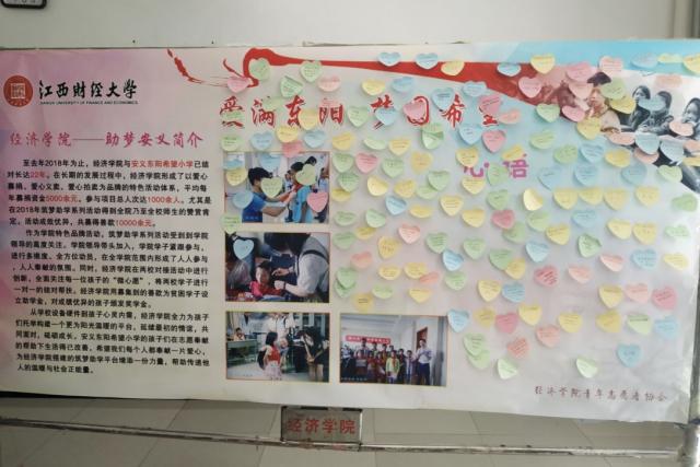 为使活动赢得更多人关注,青协通过线上微信、QQ,线下张贴海报的方式开展宣传工作,通过班支积极动员各班同学积极参与其中,并在活动开始前一天提前进行展板的布置,准备精美的便签方便同学书写微心愿。活动当天,志愿者们提前来到活动场地,在确认活动流程准确无误后,根据活动的不同需要将志愿者们分为三组,第一组对前来参与的同学耐心讲解活动内涵,积极号召周围及同班同学参与到活动之中;第二组引导同学们书写微心愿粘贴在展板上;第三组进行现场秩序的维护工作,确保活动安全有序的开展。新颖的活动形式吸引众多学生参与其中,每一张心愿便签都承载了经院学子对安义小朋友最真挚的心愿,希望所有的祝福到达安义东阳希望小学的每一个角落。活动结束后,志愿者们认真整理现场,归还座椅等物品,并合影留念。