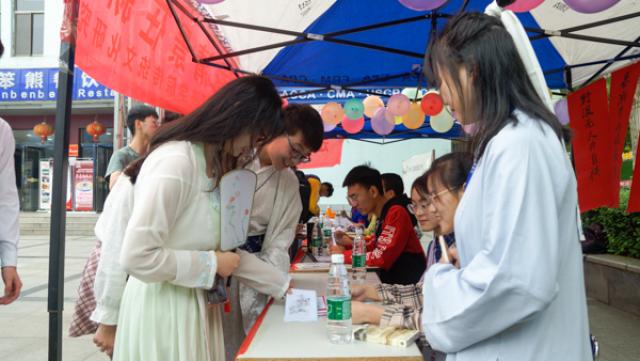 4月27日,亚洲色吧 传统文化研究社(以下简称“传文社”)于麦庐园组织开展传统文化节摆点活动。许多同学前来了解咨询,积极参与相关传统文化游戏活动。