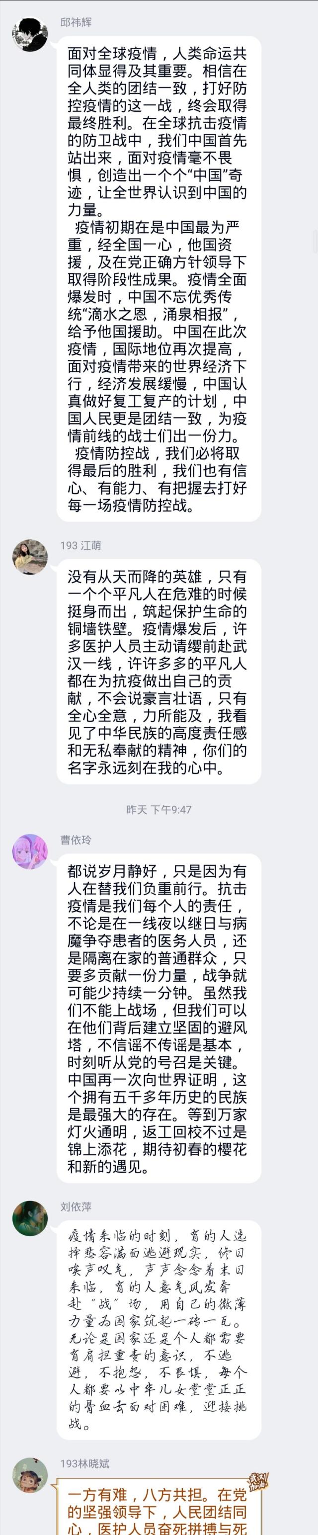 经济194班卢柯羽:面对疫情,我们同舟共济,携手并进,拧成一股绳,更加深刻地了解到了新冠肺炎疫情爆发期间全国各方所做出的努力,感受到社会主义制度下国家和民族的强大凝聚力。一件件抗疫期间感人事迹纷纷在眼前浮现,一位位抗疫英雄的崇高形象深深地印入脑海,感动着素未谋面的每一个人。当今世界面对着百年不遇的大变局,没有一个国家一个民族可以独立于世界之外而得以存续。如今面对全球蔓延的重大疫情,唯有坚持构建人类命运共同体,交流帮助,互通有无,开展合作,才能战胜困难,共克时艰,彻底打赢这场疫情防卫战!