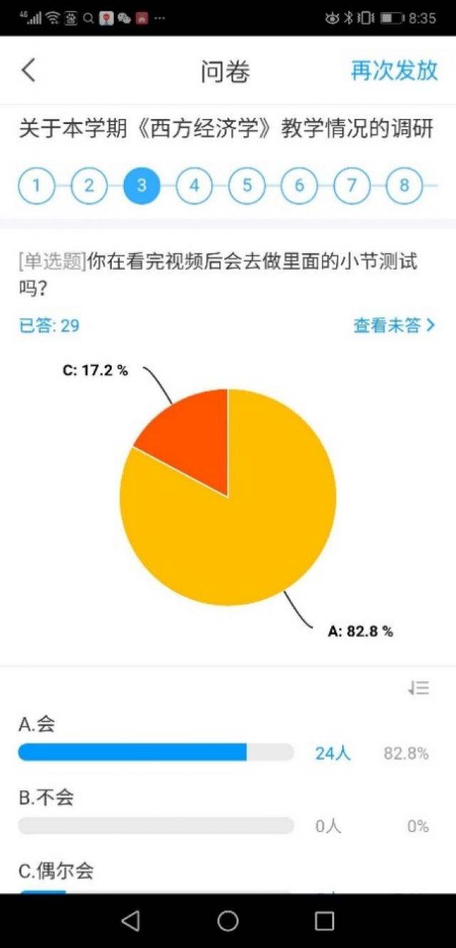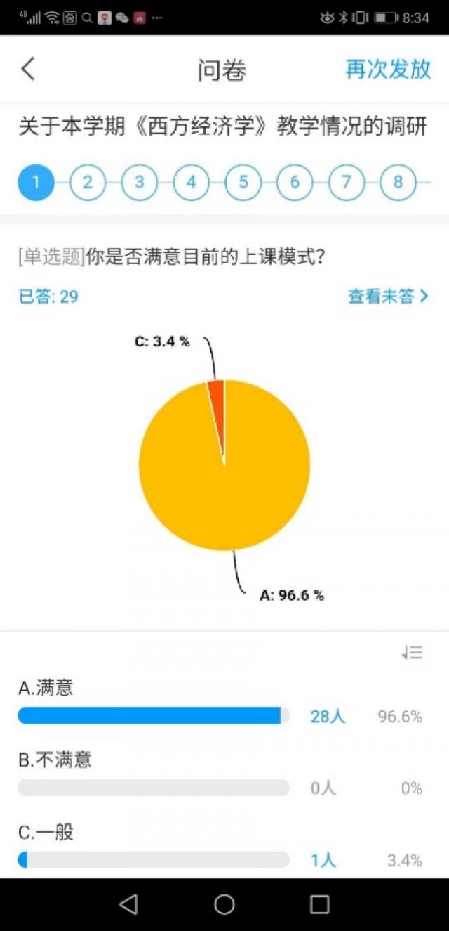 开展线上课堂教学四周后,我就课程教学满意度、线上自主学习参与情况、平台资源运用、学习过程中存在的困难等方面发布问卷调研《西方经济学》线上教学活动情况。调研结果显示:绝大多数学生都满意目前的上课模式,也都比较积极参与MOOC平台上的各项自主学习活动;但还是有少数同学自主学习参与度不高;学生也反映了没有教材难以系统学习,学习环境比较差,没有充裕的时间参与线上自主学习,网络不通畅,自控力不足等学习过程中存在的困难;此外,学生也提出希望在课堂教学过程中多些练习,多采用抢答方式解答问题,适当延长单元测验时间等建议。