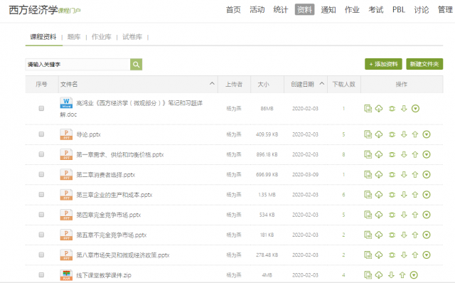 在学校网络教学平台上激活课程后,将精心编写的教学大纲、教学进度计划表、线上教学日历、教学课件等一些重要的教学资料及时上传到学校网络教学平台上,并将教学课件、教学案例、学习笔记、教材课后习题答案等学习资源上传到学校网络教学平台中的资料栏目中供学生下载学习。