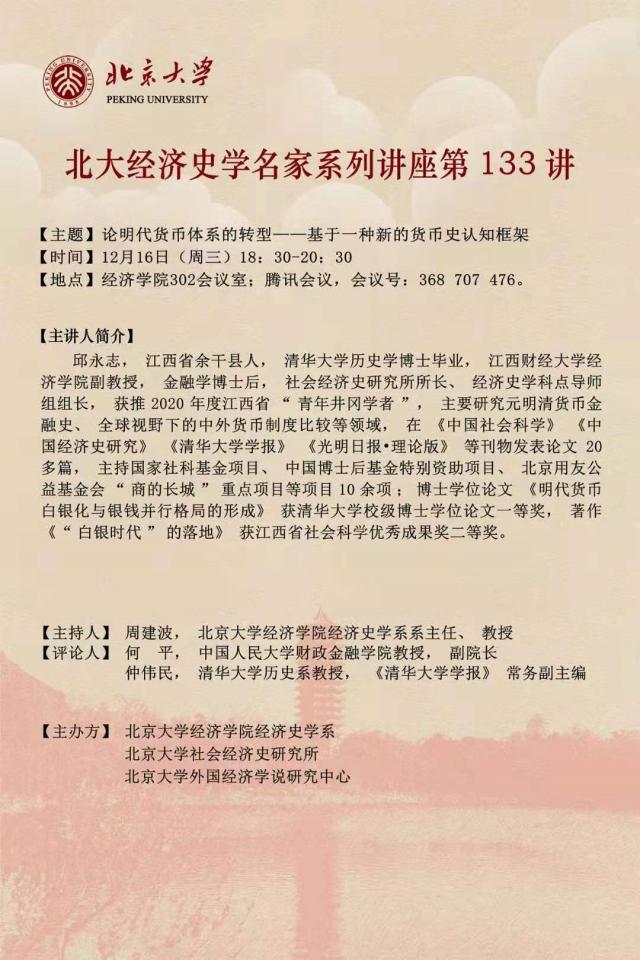2019年12月16日晚上18:30,应北京大学亚洲色吧 张亚光副院长、经济史学系主任周建波教授的邀请,亚洲色吧 邱永志副教授赴北京大学亚洲色吧 开展“北大经济史学名家系列讲座第133讲”,演讲题目为“论明代货币体制的转型——基于一种新的货币史认识框架”,讲座由周建波教授主持,中国人民大学财政金融学院何平教授、清华大学历史系仲伟民教授担任讲座评议人,线上线下共计100余人参与本次讲座。
