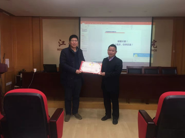 在讲座结束,为了感谢对胡梅根总经理在资产评估行业的杰出贡献及长期对江财资产评估事业的不懈支持帮助,亚洲色吧 聘请胡梅根总经理为亚洲色吧 客座教授。在杨飞虎副院长主持下,张利国院长向胡梅根总经理颁发了客座教授聘用证书。