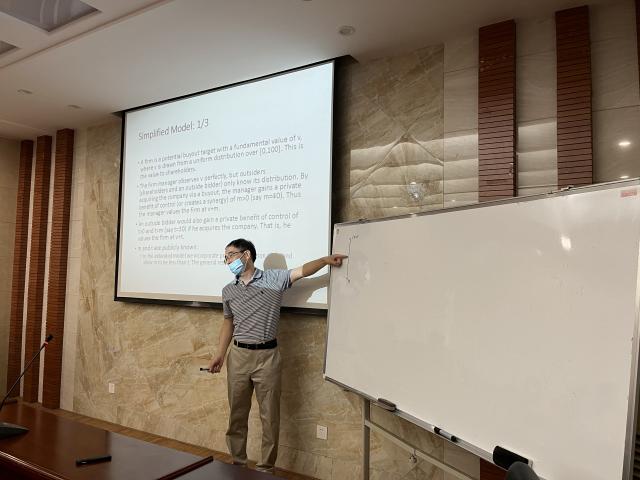 刘挺军教授的讲座分两个环节依次进行。在第一个环节,刘教授报告了他的最新工作论文:基于拍卖理论,建立股东、管理层、外部竞买人三者之间博弈关系模型,分析管理层收购中的信息披露问题。研究发现,相对于无外部竞买人参与收购时管理层对公司价值信息的披露尺度,股东引入外部竞买人试图与管理层在公司收购上展开竞争,但这会降低管理层关于公司价值信息的对外披露尺度,而信息披露尺度的降低会对股东在出售公司的收益上产生不利影响。进一步发现,股东在选择外部竞买人时,并不是溢价水平越高的人越好,而是存在一个最优的溢价水平:外部竞买人的溢价水平越低于该溢价水平,股东的收益越低;外部竞买人的溢价水平越高于该溢价水平,股东的收益也越低;股东引入处于该溢价水平的外部竞买人参与收购竞争,会使得自己在管理层关于公司价值信息披露尺度缩小而给自己的收益造成不利影响的情况下使自己的收益最大。
