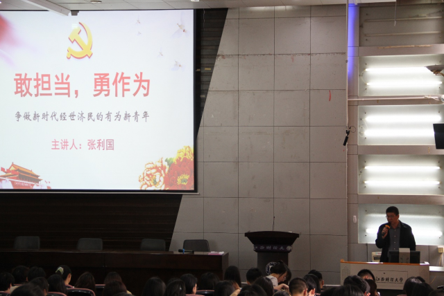 张利国强调敢于担当是中国共产党人的优良品格,青年人应谨记习近平总书记“牢记党的教诲,立志民族复兴,不负韶华,不负时代,不负人民,在青春的赛道上奋力奔跑,争取跑出当代青年的最好成绩。”张利国用生动形象的语言向同学们深入介绍了担当作为的内涵,感悟担当作为的重要性,担当作为是党员的基本素质,是共产党人鲜明的政治品格。