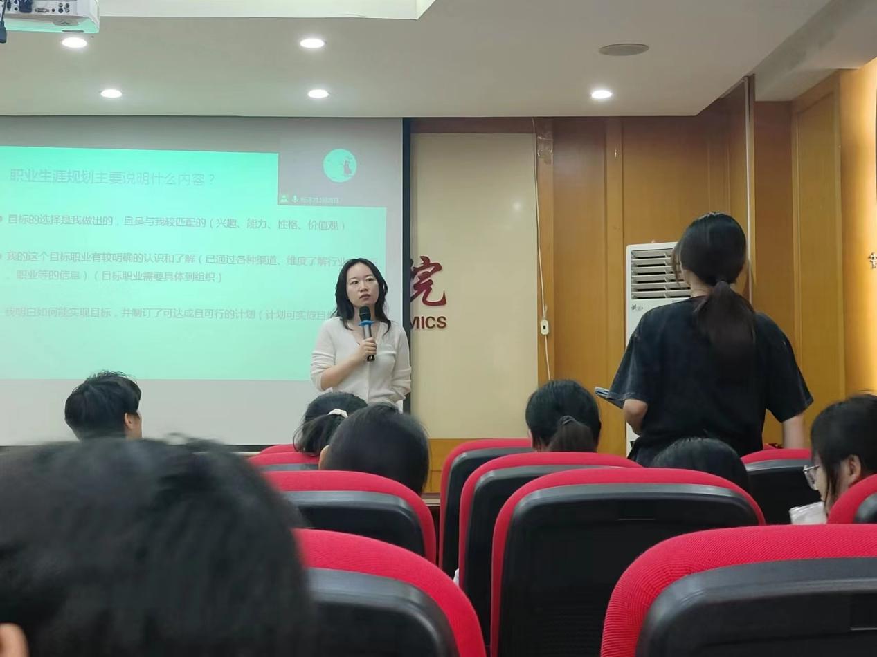 通过与学生的积极互动,刘君男主任介绍了如何写好职业生涯规划书。她谈到要从自我与外界的探索,规划行动和评估调整三个维度进行展开,主要关注于对自我与职业世界的探索。在自我探索中要结合自己过往的经历,通过爱兰德职业兴趣测评、mbti性格测评、职业能力倾向测评等测评工具将性格与兴趣做到更好匹配。
