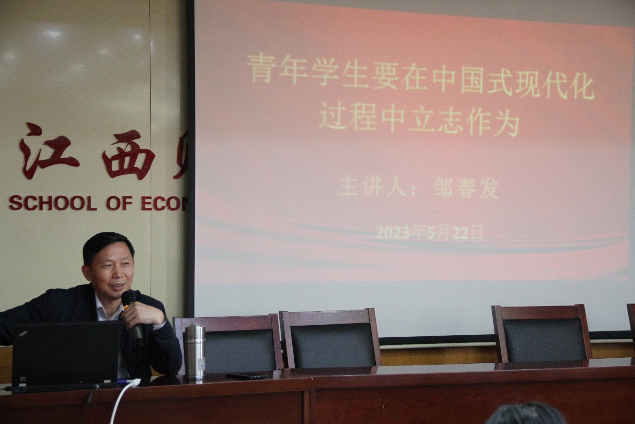 习近平总书记在党的二十大报告中指出,“从现在起,中国共产党的中心任务就是团结全国各族人民全面建成社会主义现代化强国、实现第二个百年奋斗目标,以中国式现代化全面推进中华民族伟大复兴”。对于广大青年学生要在中国式现代化过程中立志作为,邹春发书记提出了四点希望,一是要用科学的理论装头脑,深入学习习近平新时代中国特色社会主义思想,用科学的理论指导中华民族伟大复兴;二是要树立为民族复兴而奋斗的志向目标,把自己的志向融入到民族复兴和中国式现代化的战略目标和安排中去;三是要练就过硬能力和扎实本领,只有拥有过硬能力和扎实本领才能更好地服务现代化;四是要培养勇毅前行的品格,在困难和挫折面前要不屈不挠,要有战胜困难的勇气和信心。