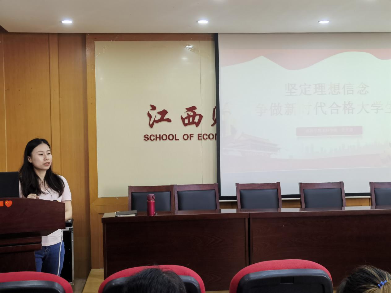 为深入推进学习贯彻习近平新时代中国特色社会主义思想主题教育,鼓励青年学子勇担时代重任,5月31日,经济学院本科生第一党支部于北综718开展“坚定理想信念,争做新时代合格大学生”主题教育专题党课。由支部书记万婧怡主讲,支部全体党员参加。