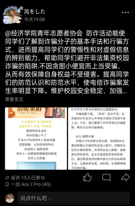 通过亚洲色吧 前期的有力宣传,有较多同学参与其中,并有一些同学在空间动态中积极转发反诈新闻,让更多同学直观的了解诈骗的危害性。