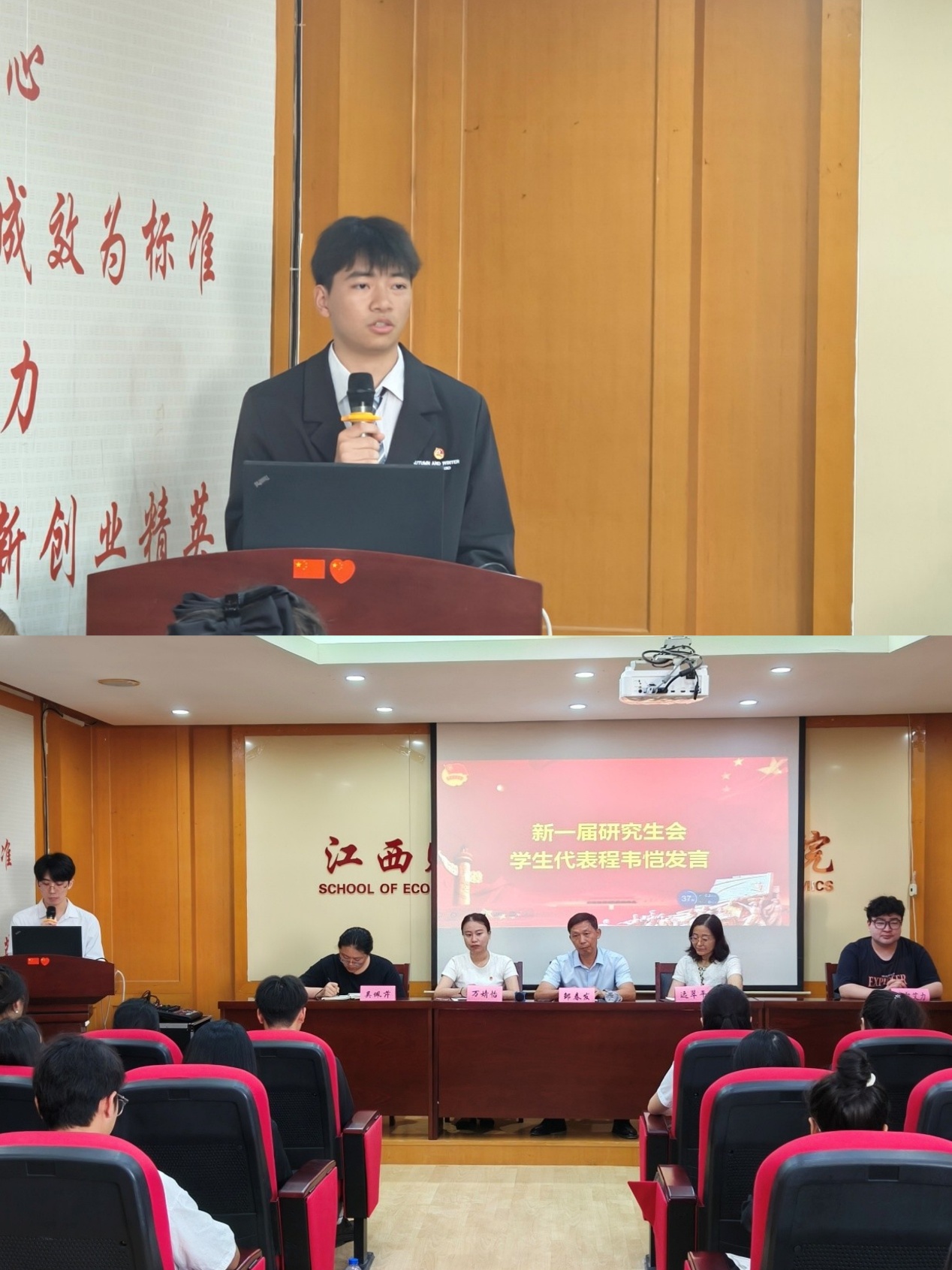新一届团委学生会学生代表冀科璇、研究生会学生代表程丰恺对学院领导老师的付出和帮助表达了感恩,并且向新一届学生会干部提出工作思路的建议,他表示将脚踏实地,保持积极的工作状态,为学院事业添砖加瓦。