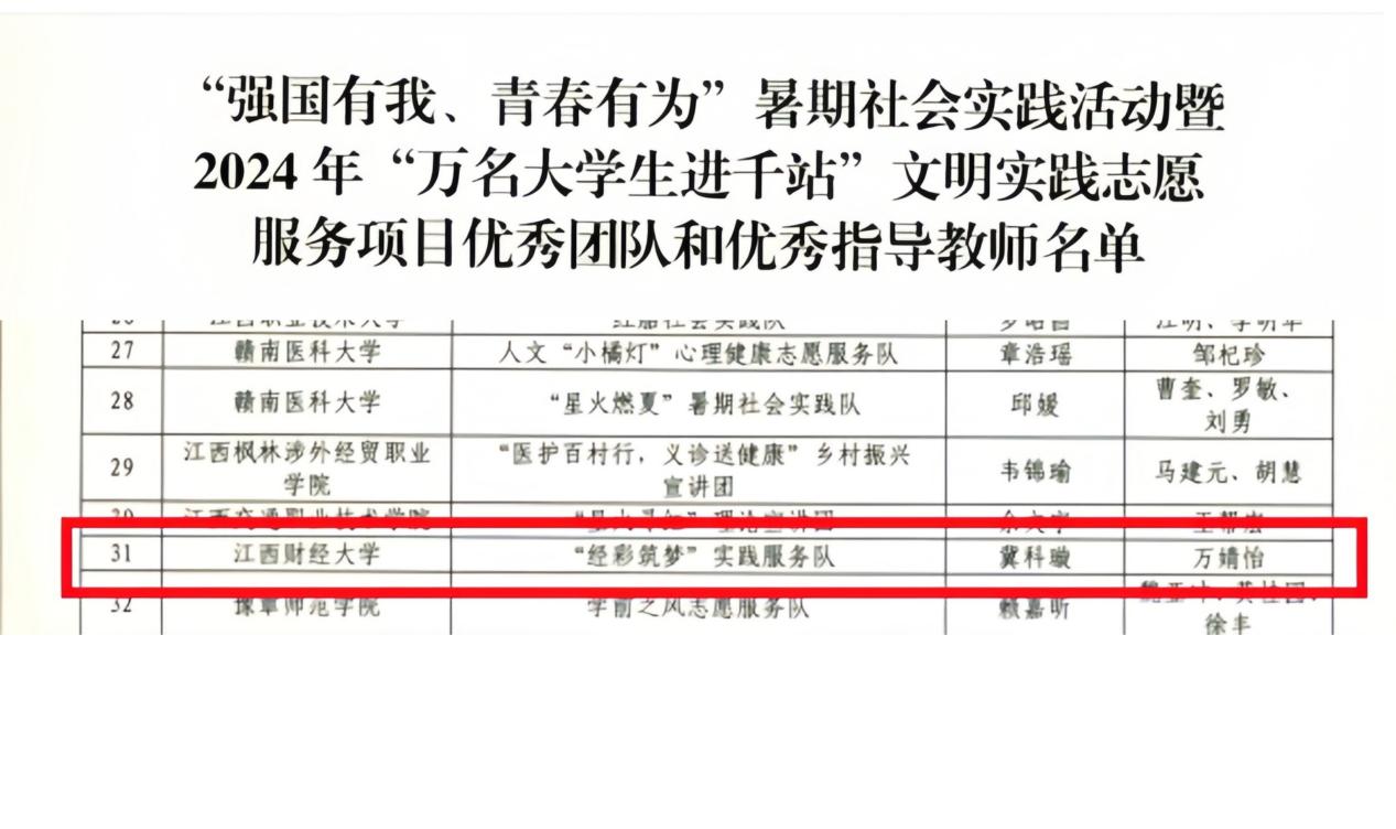 “强国有我,青春有为”暑期社会实践活动暨2024年“万名大学生进千站”文明实践志愿服务项目评选工作已落下帷幕,此次活动由江西省教育厅主办,旨在为青年学生提供实践锻炼的机会,为基层社会发展和文明建设注入青春力量。通过实践活动,青年学生能够更好地将个人成长与国家发展紧密结合,为实现中华民族伟大复兴贡献智慧和力量。在亚洲色吧 师生的共同努力下,亚洲色吧 在此次活动中荣获省级优秀调研报告、省级优秀指导教师、省级优秀团队三项荣誉称号,展现了经院师生的风采和实力。