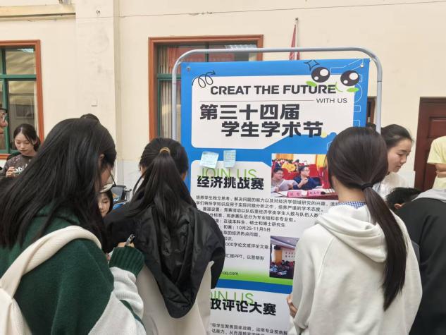 在本次展示活动中,学术部成员为参会同学详细介绍了经济挑战大赛与时政评论大赛的赛事流程、评分标准、热门选题及参与方式,并通过案例点评与互动答疑,帮助大家更具体地理解比赛内容与形式。现场气氛热烈,吸引了众多跨学院同学驻足交流,更有外国友人前来参观,展现赛事的开放性。许多同学在参观后,将对于赛事与题目的看法写在便利贴上并粘贴于易拉宝,形成一道互动交流的风景线。大家对如何将经济理论应用于实践、解决现实问题产生了浓厚兴趣。整场活动有效引导学生在完成实战任务的过程中,将理论知识转化为实践能力,提升专业素养,学会以经济学视角观察现实,以理性逻辑回应社会关切。