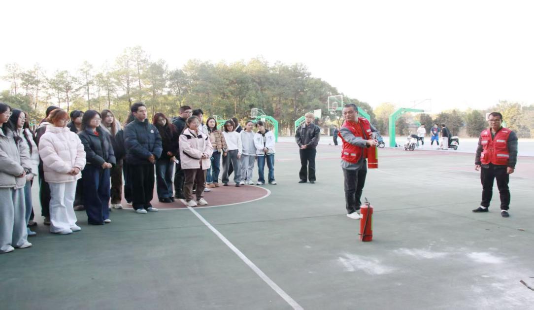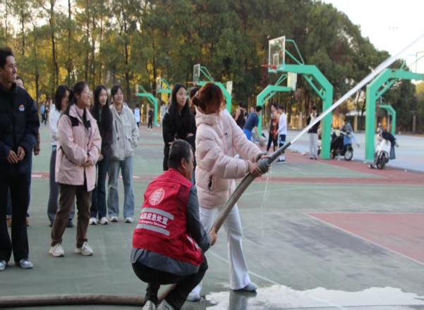 篮球场的实操教学环节,保卫科工作人员通过结合具体案例,深入浅出地教学灭火器、高压水枪的使用方法和注意事项,将“提、拔、握、压”的灭火器使用口诀与高压水枪的操控技巧讲解的深入人心。同学们踊跃参与实操,在工作人员的耐心指导下,亲手完成灭火演练,真切感受火焰扑灭的瞬间,将理论知识转化为实战能力。